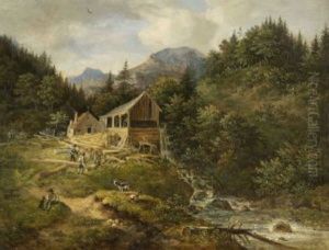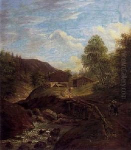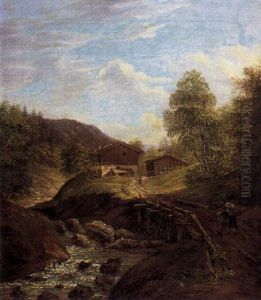 Bayerische Gebirgslandschaft Mit Hausern Und Einer Steinernen Brucke Uber Einem Sturzbach Und Figuren