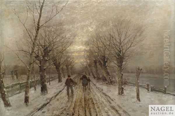 Winterliche Allee Mit Bauernfamilie An Einem Kanal