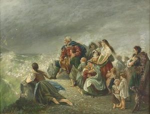 Winterliche Fluslandschaft Mit Landvolk Und Dorfansicht.