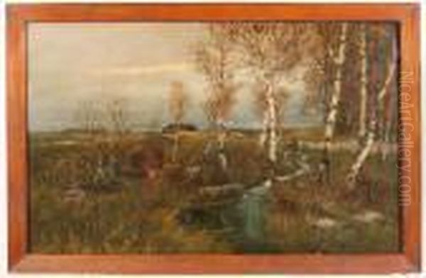 Herbstliche Landschaftmit Bachlauf Unter Birken