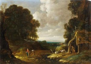 Attribuito Un Eremita Con Due Compagni In Un Paesaggio Fluviale Boschivo