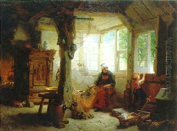 Netzeflickende Frau Mit Einem Kind Am Fenster