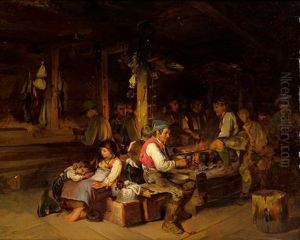 In Der Schlosshalle, Links Am Tisch Zwei Jagdherren, Darunter Der Kunstler Selbst, Schach Spielend, Vor Ihnen Die Jagdbeute