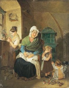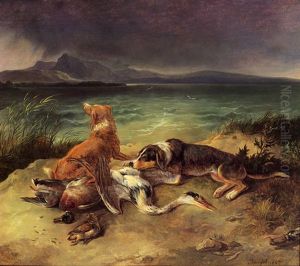 In Der Schloshalle - Links An Einem Tisch Zwei Jagdherren, Darunter Der Kunstler Selbst, Schach Spielend Vor Ihnen Die Jagdbeute