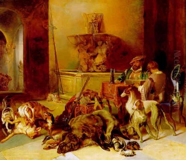 In Der Schlosshalle, Links Am Tisch Zwei Jagdherren, Darunter Der Kunstler Selbst, Schach Spielend, Vor Ihnen Die Jagdbeute