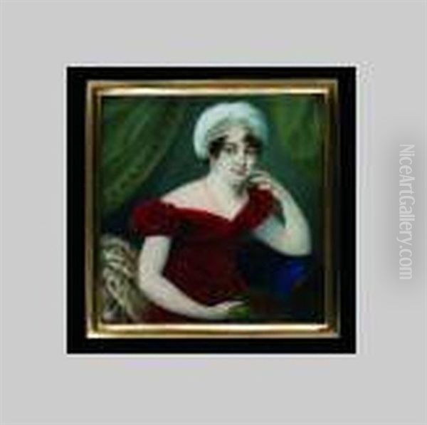 Lady, Seated, Wearing A Red Dress, White Turban Headdress, Jewelled Earrings, Gold Folding Spectacles On A Chain At Her Neck, A Laurel-leaf Crown In Her Right Hand, A Floral Shawl To Her Right