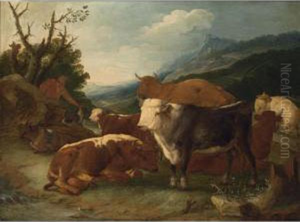 An Italianate Landscape With A Herdsman And His Cattle And Dog In A Meadow