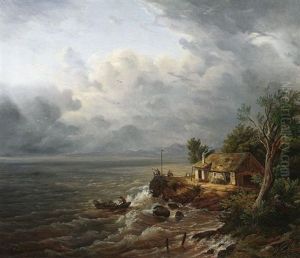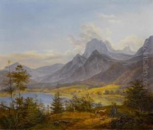 Gebirgslandschaft Mit See, Im Vordergrund Ein Hirte Mit Rindern Und Hund