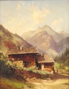 Alpenlandschaft Mit Bergbauernhof, Hirtin Und Vieh