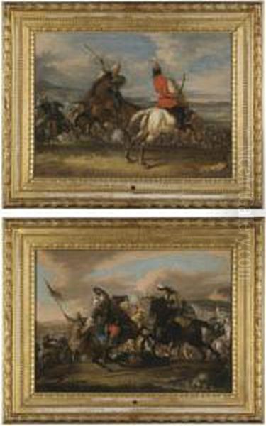 A Cavalry Battle Between Turks And Christians, A Christian Officer Shooting A Pistol; A Cavalry Battle Between Turks And Christians, A Turk Raising His Spear