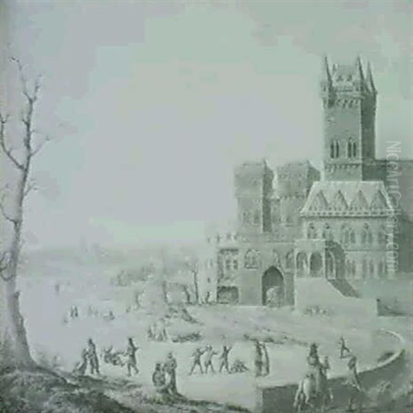 Canal Gele Avec Patineurs Devant Un Chateau