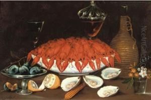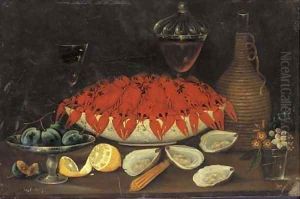 Stilleben Mit Hummer In Porzellanschale, Austern, Zitrone, Flechtkorbflasche Und Weinglas