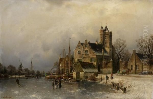 Winterlandschaft Mit Burg An Einem Zugefrorenem Kanal