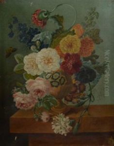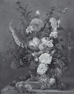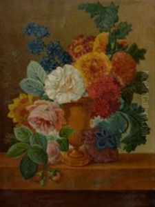 Roses, Lilies, Violets And Other Flowers In An Urn On A Ledge