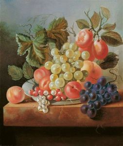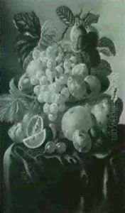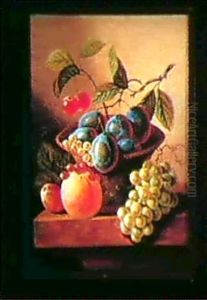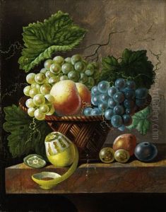 A Still Life Of Grapes, A Peach, Prunes And Red Currants In A Basket, Together With An Orange And White Currants On A Marble Ledge