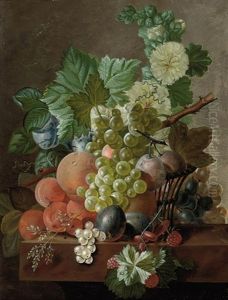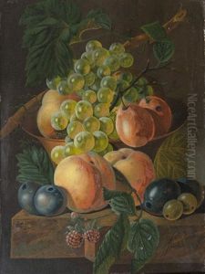 Stilleben Mit Pflaumen, Kirchen, Preiselbeeren, Trauben Und Pfirsichen In Einem Geflochtenen Korb Auf Einer Steintischplatte