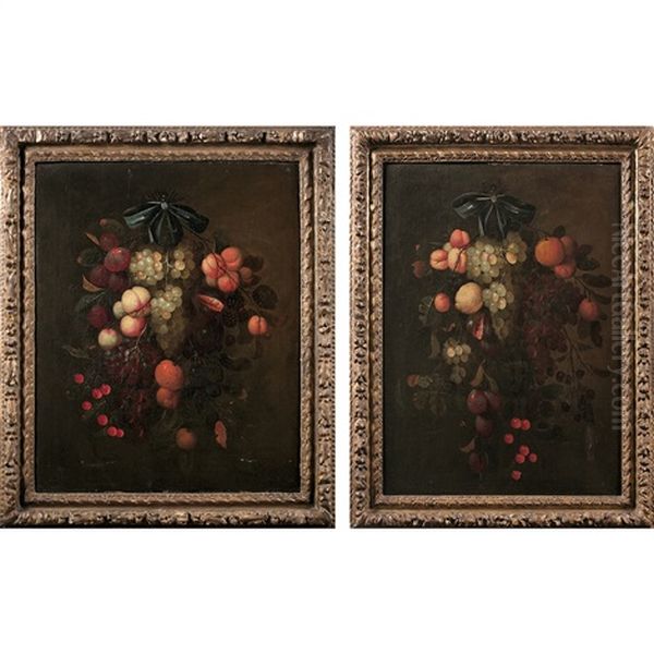 Guirlandes De Fruits Retenues Par Des Rubans Bleus: Peches, Raisins, Abricots, Prunes