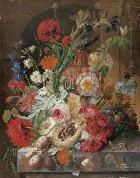 Irises, Peonies, Roses, And Other Flowers Surrounding A Terracotta Urn, With A Birds' Nest, Grapes, And Plums