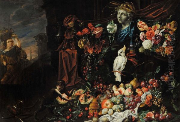 Detto Monsu' Aurora Fiori E Frutta Con Cane, Scimmia E Pappagallo