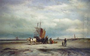 Fishermen, Boats And Horsedrawn Cart On Shore