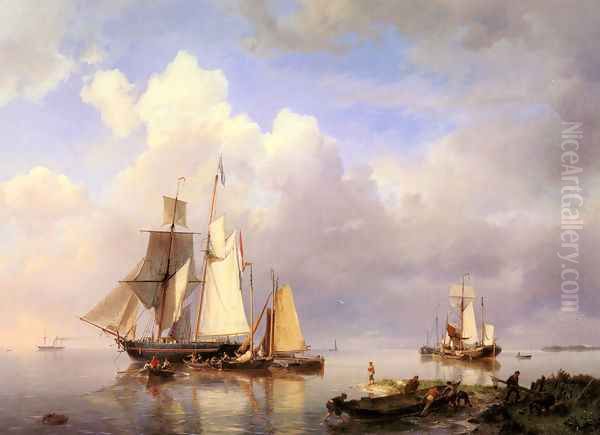 Vessels at Anchor in an Estuary with Fisherman hauling up their rowing boat in the Foreground