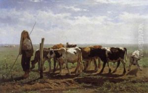 Hirtenjunge Mit Kuhen In Einer Landschaft