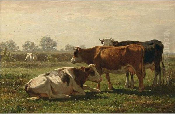 Cows In A Summer Landscape Oil Painting by Johannes-Hubertus-Leonardus de Haas