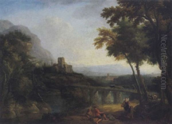 Bewaldete, Sudliche Fluslandschaft Mit Einer Steineren Brucke, Ruinen Und Figuren