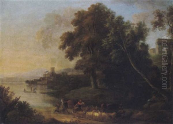 Bewaldete, Sudliche Landschaft Mit Palastartigen Gebauden Und Hirten An Einem See