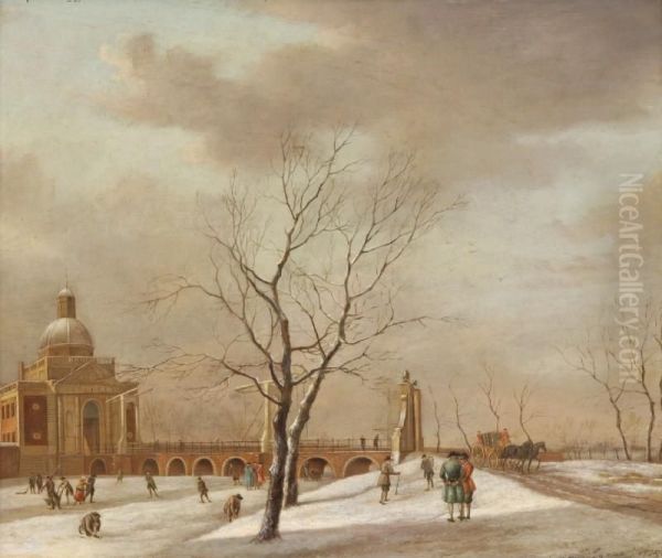 A View Of Themuiderpoort, Amsterdam, In Winter, With Skaters On The Frozensingelgracht An A Horse-drawn Carriage On The Road