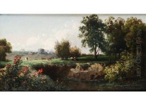 Cows In A Meadow By A Wooded Lane, A Farm Beyond
