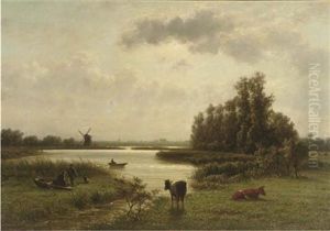 Dutch Landscape With Labourers On Dirt Track, Windmills In Far Distance