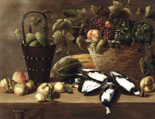 Apples, pears, a melon, a bucket with gherkins and a basket with grapes, peaches and artichokes, all on a wooden table with four lapwings