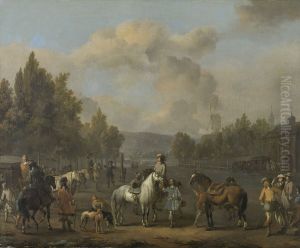 Travellers Arriving In A Village With Figures By Classical Ruins