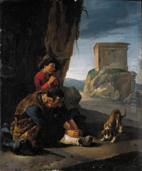 Vagabonds Resting By A Cliff On A Pass; And A Peasantwoman With Herchildren Resting By A Fence In Italianate Landscapes
