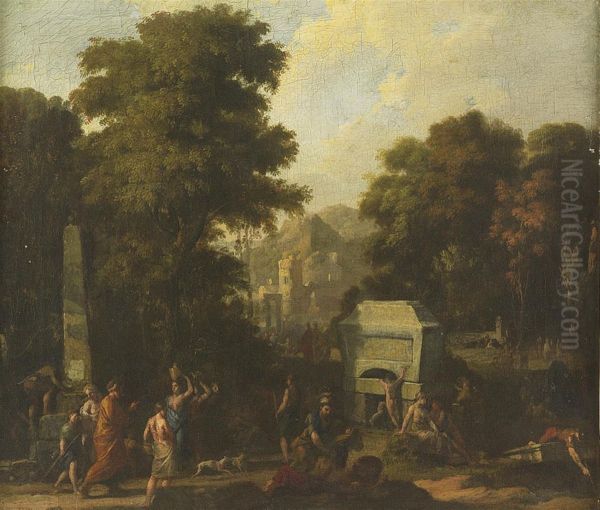 Italianate Landscape With Figures By An Obelisk And Tomb, A Village Beyond