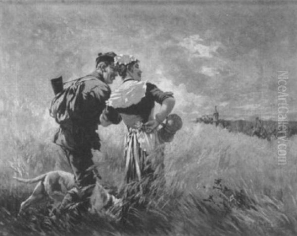 Jager Mit Hund, Eine Junge Frau Durch Das Kornfeld Begleitend
