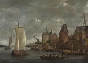 A River Landscape With Travellers On A Ferry Boat And Other Shipping By A Quayside