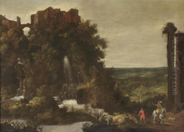 A Landscape With A Waterfall And Elegantly Dressed Travellers On A Path