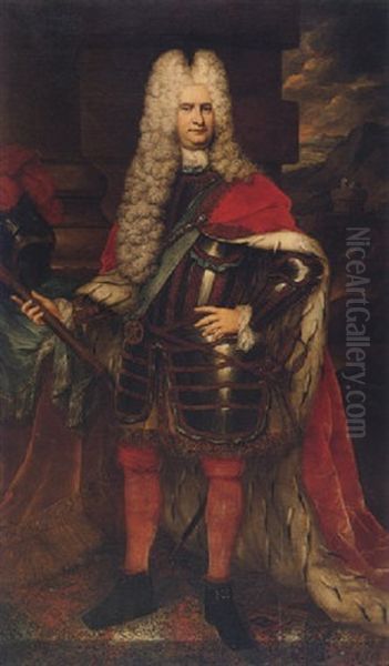 Portrait Of A Gentleman Wearing The Order Of The Thistle, In Armour And A Red Velvet Ermine Lined Cloak, Holding A Marshall's Baton
