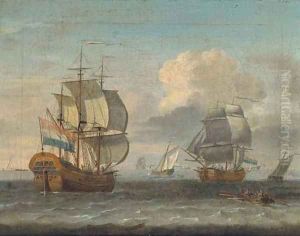 Shipping on the IJ off Amsterdam with a bezan yacht, a Dutch man-o'-war, a wherry and other shipping