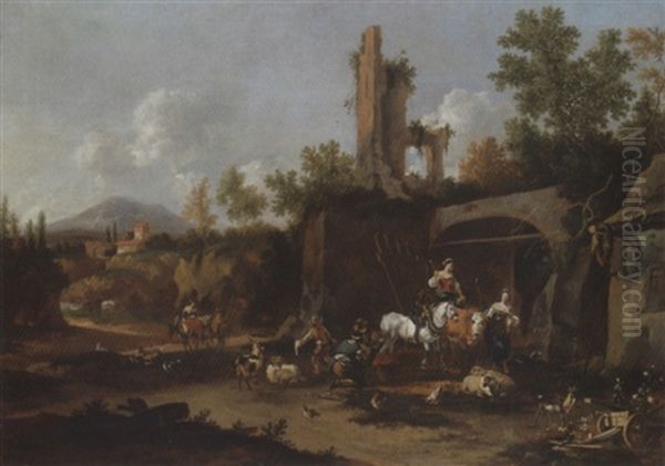 An Italianate Landscape With Peasants At A Forge Among Roman Ruins