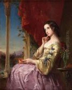 Portrait Of A Young Girl, Three-quarter-length, In A White Cloak, Holding A Posy Of Flowers On A Terrace