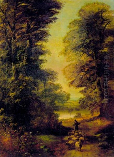 A Shepherd Herding His Sheep On A Wooded Pathway