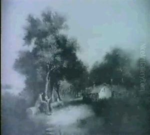 A Landscape With A View Of A Cottage And Figures On A Path Beside A Pond