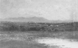 Panoramic New England Landscape With Figure At Foreground, Village With Church Spire At Middle Distance And Lake Beyond (champlain?)