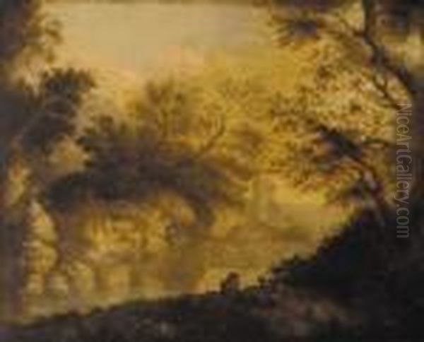 An Angler In A Wooded River Landscape, A Ruined Castle Beyond