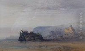 Beach Scene With Figures And Distant Sailing Vessels Under Distinctive Cliffs