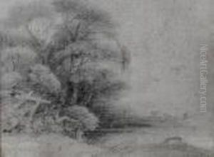 A River Landscape With A Horse And Cart Crossing A River Near A Cottage, A Church Beyond