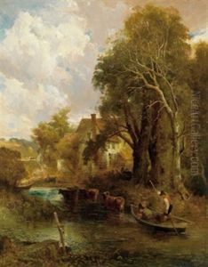 Cattle Watering With Anglers And A Cottage Beyond